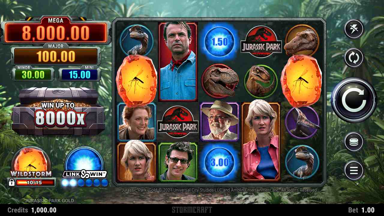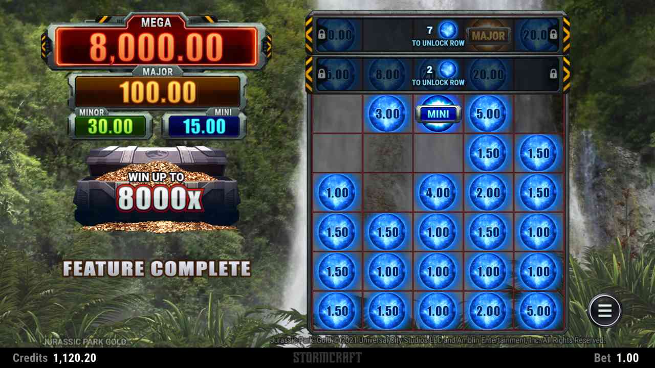 jurassic-park-gold-slot-link-and-win-feature 6 or more bonus scatter symbols (Powerball symbols) landing in the base game will trigger this Link & Win feature with 3 spins. Unlock additional rows by landing more Powerball symbols. Here’s how many you need to unlock each row: