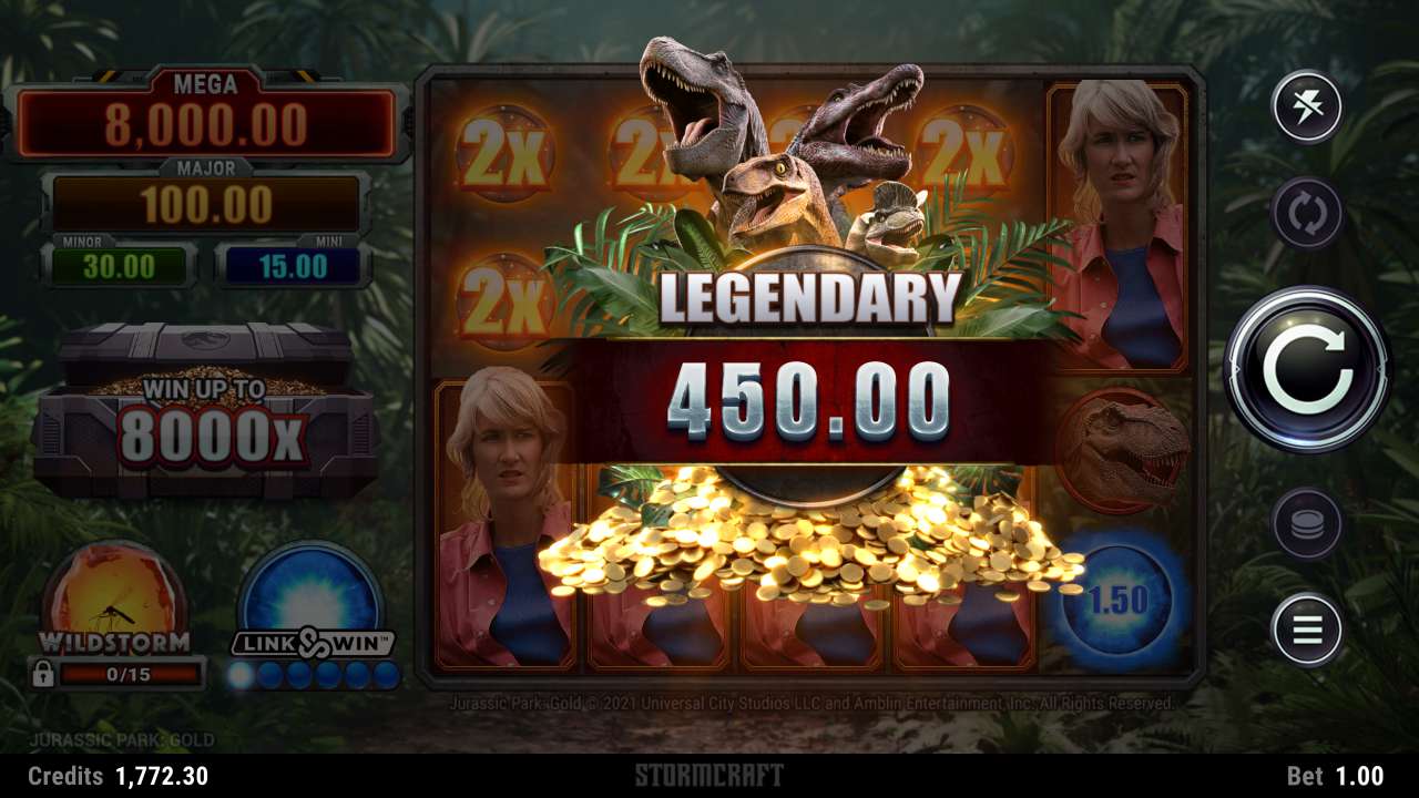Dilophosaurus Free Spins – Win up to 3,600x with 12 free spins that can be retriggered. This is unlocked after the 1st free spins trigger and includes a wild win multiplier of 2x, 5x or 8x.